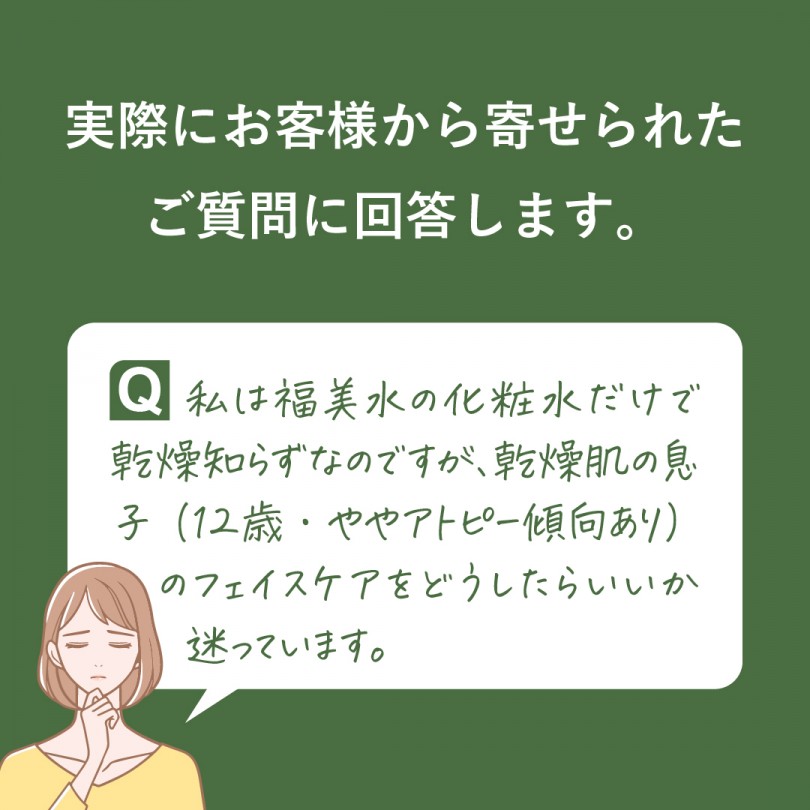 Q私は福美水の化粧水だけで乾燥知らずなのですが、乾燥肌の息子(12歳 ややアトピー傾向あり)のフェイスケアをどうしたらいいか迷っています。