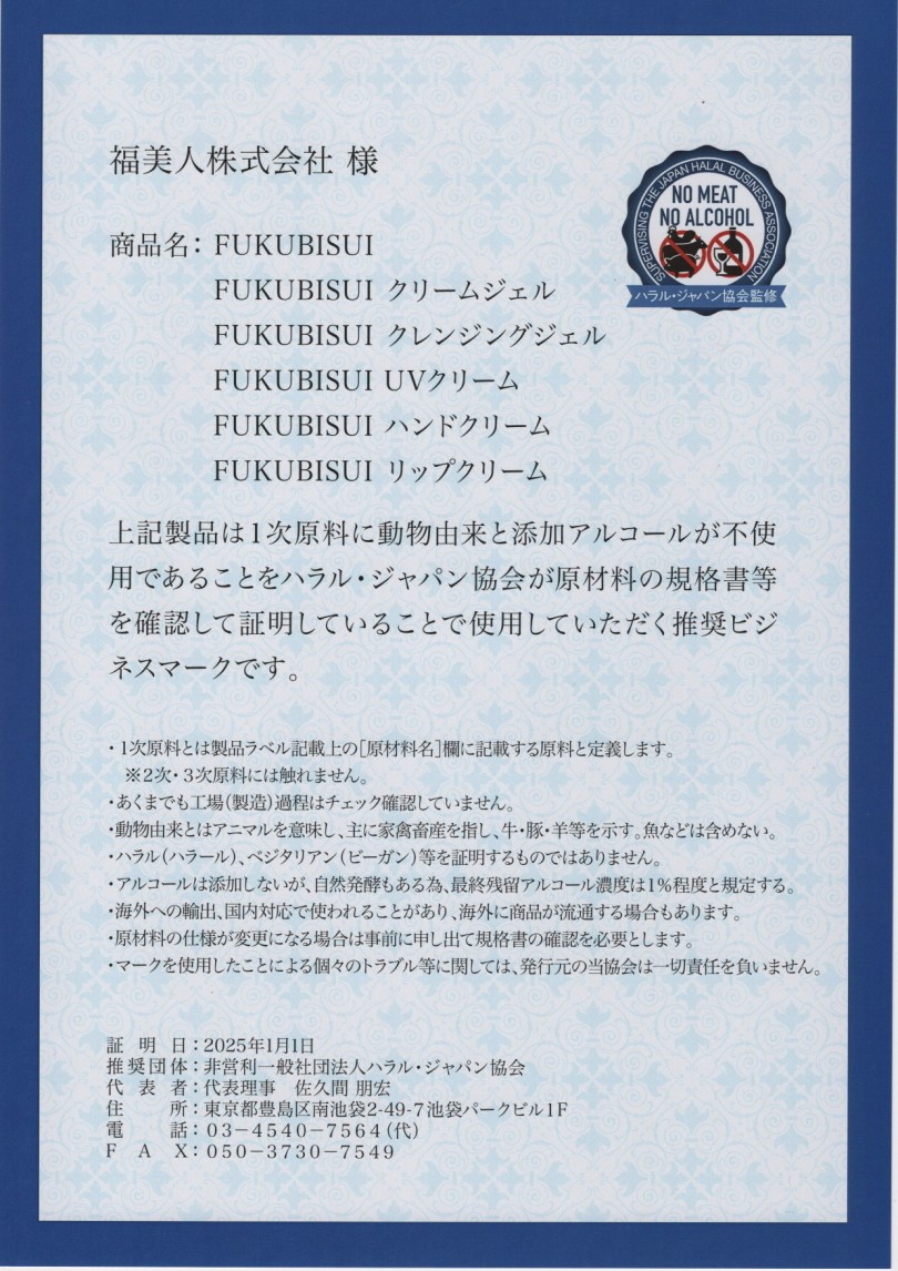 FUKUBISUIはアルコールも豚製品も使用していないので、